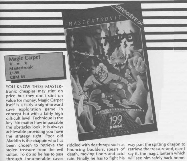 Magic Carpet es un título primerizo de la famosa Mastertronic. Un arcade divertido y típico de la época, sin ser un alarde de imaginación pero correcto para pasar un rato. Es un juego de 3 pantallas donde hay que esquivar todo lo imaginable hasta llegar al dragón final y arrebatarle la lámpara mágica.